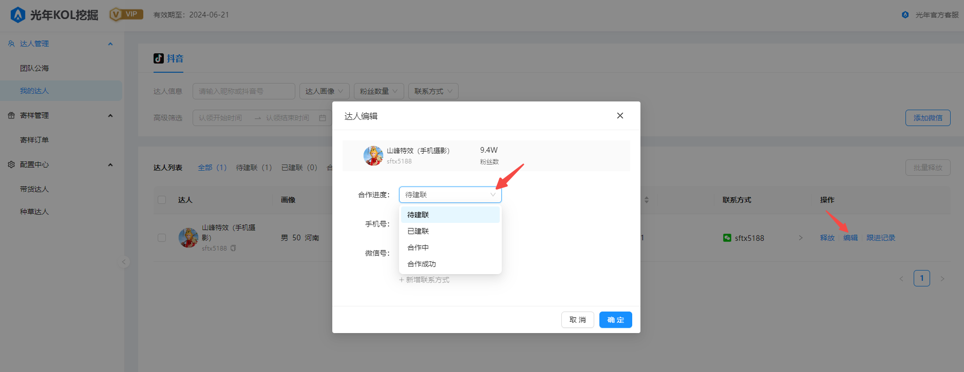 根据和达人的建联状态和合作进度等,点击【编辑】对跟进状态进行修改