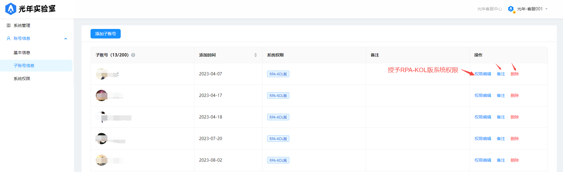4)可针对某个子账号进行系统授权、备注和删除操作,被删除的子账号的【我的达人】内的达人将自动回流至团队公海