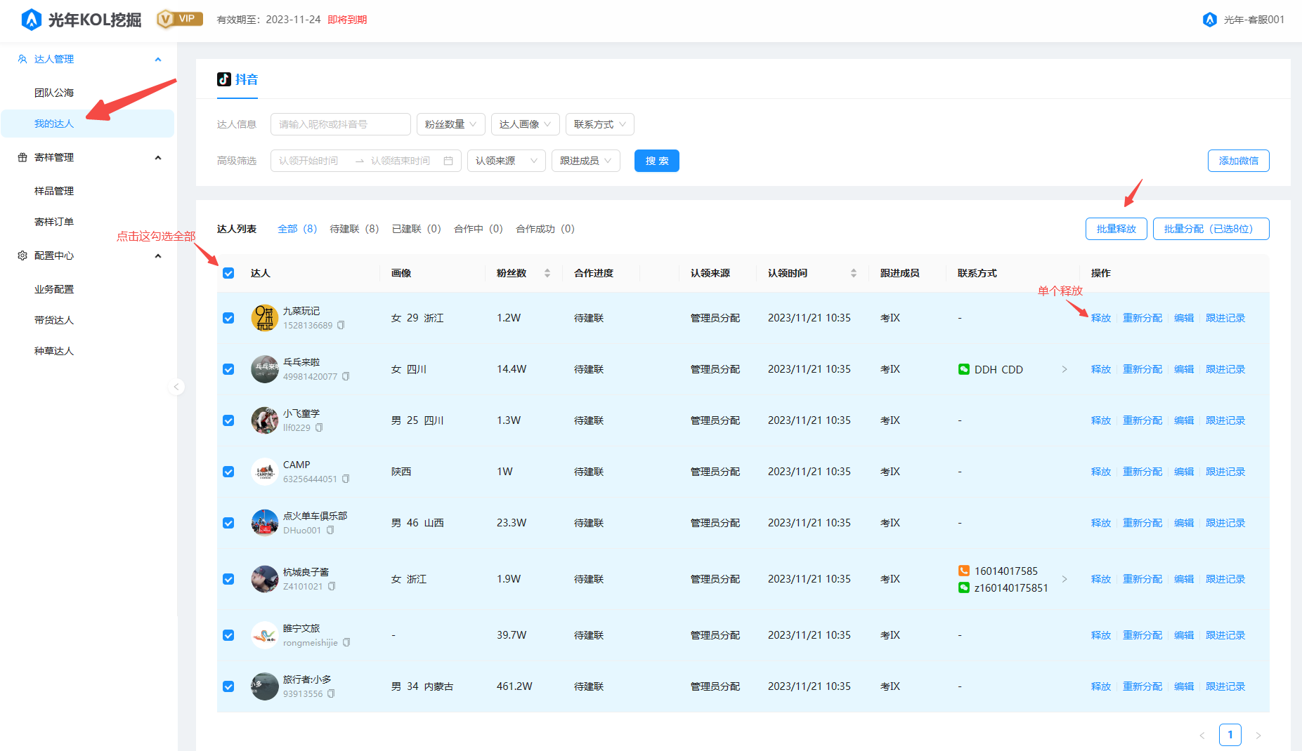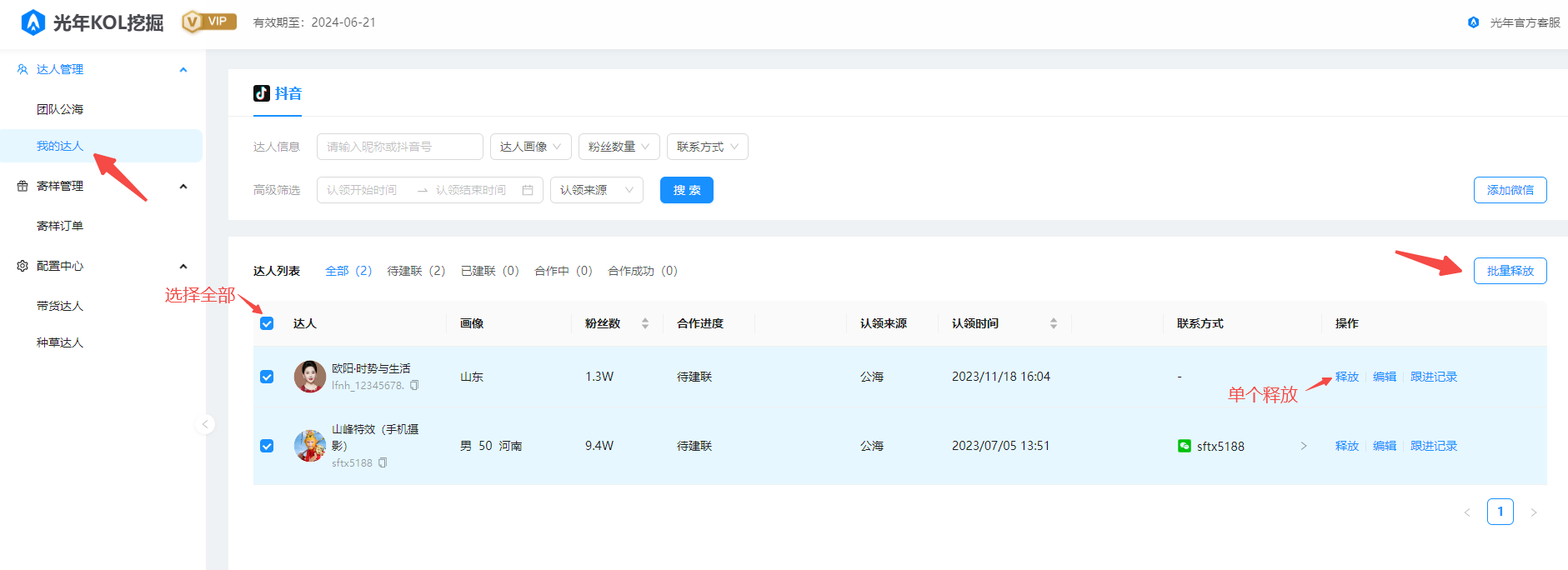 批量释放:在【我的达人】内勾选中目标达人(管理员的我的达人页面包含所有子账号下的数据),点击【批量释放】按钮,确认释放后选中的将自动回流至团队公海