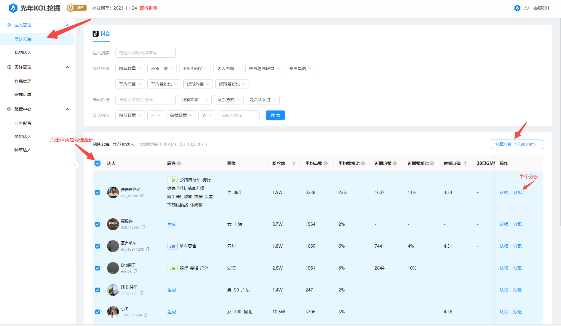 批量分配:在【团队公海】或【我的达人】内勾选中目标达人,点击【批量分配】按钮,选择需要承接的运营账号,确认后选中的达人将自动分配至对应运营账号的【我的达人】内;
