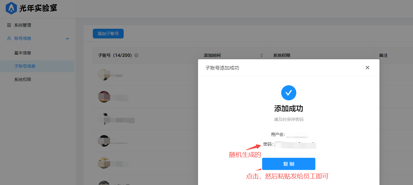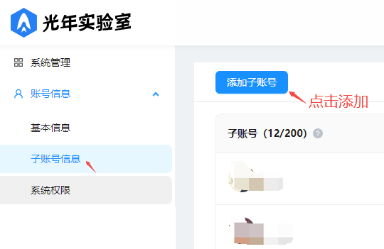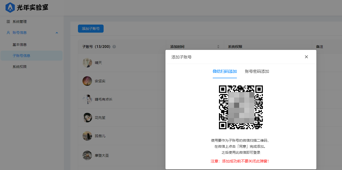 2)导航至【光年实验室】系统平台-【子账号信息】栏,再点击【添加子账号】按钮,系统将弹出二维码弹窗;