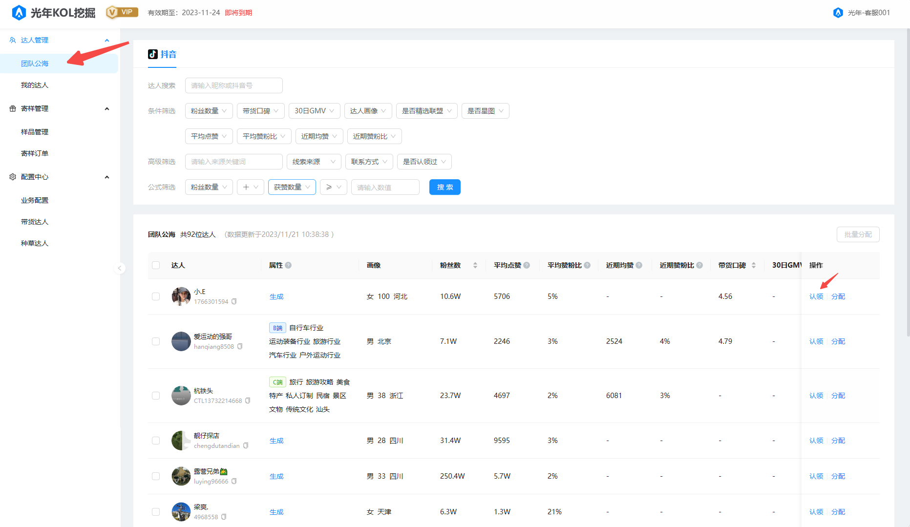 团队公海认领:打开【团队公海】页面,设置筛选条件,在筛选结果列表点击【认领】按钮将对应达人认领至【我的达人】;