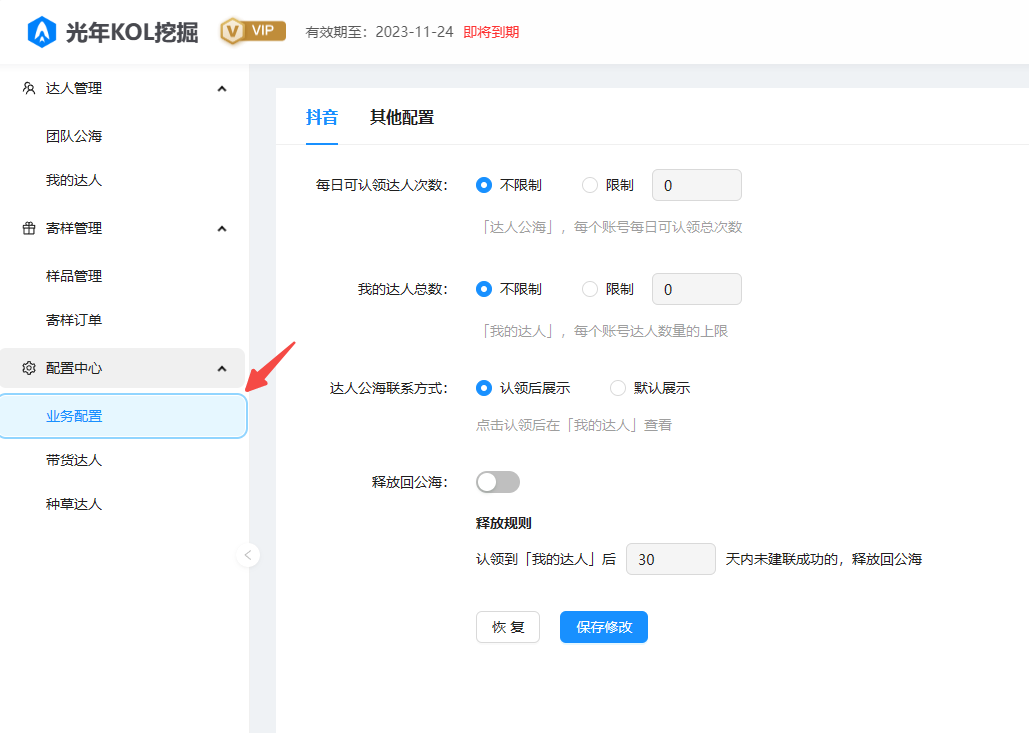 释放回公海:认领至【我的达人】后规定天数内未建联的达人自动回流至团队公海,供团队内其他人认领跟进,默认不限制